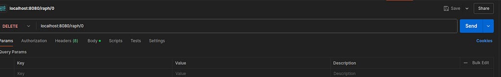 Ne nous embourgeoisons pas trop vite. Nous allons maintenant effacer ces deux camions de notre mémoire. Avez la méthode DELETE, toujours pareil on utilise le menu déroulant, mais là on met DELETE à la place de PUT (il me semblait que les PUT c’était illégal). On change l’URL « localhost:8080/raph/0 » pour l’index 0 et « localhost:8080/raph/1 » pour l’index 1 (certains d’entre vous l’auront deviné avant de le voir).