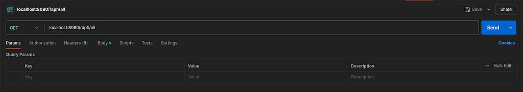 L’URL étant « localhost:8080/raph/all » normalement par défaut vous êtes en GET. Notez que le GET peut très bien être fait sur votre navigateur préféré (Netscape, Internet Explorer 6.0, konqueror …). Vous laisser les Headers par défaut et un body vide (si il n’est pas vide ce n’est pas grave). Vous pouvez maintenant appuyer sur « Send ». Vous aurez normalement résultat en dessous :