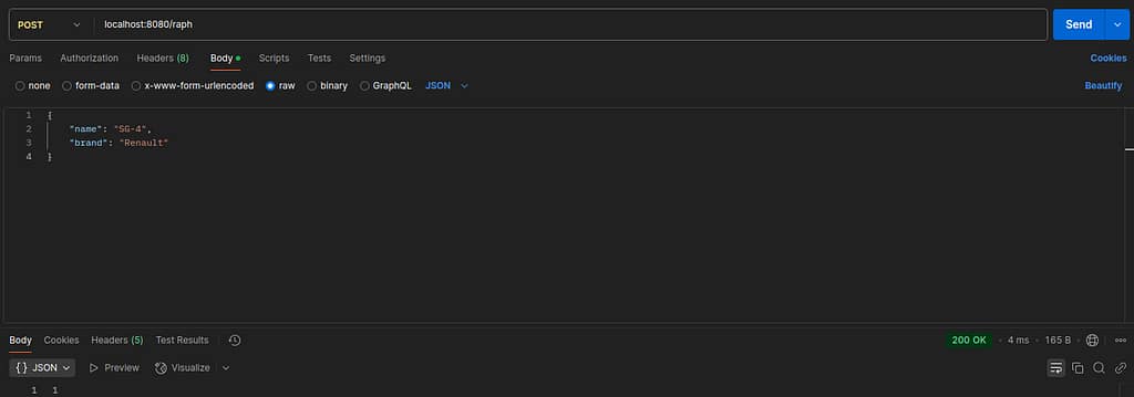 Maintenant nous allons faire un POST, rendez vous sur linkedin… Non je veux dire une requête HTTP POST sur votre serveur. Pour ça on utilise le menu déroulant où se trouve GET et on met POST à la place. On raccourci l’URL en inscrivant « localhost:8080/raph ». On va sur l’onglet Body et on indique les informations suivantes :