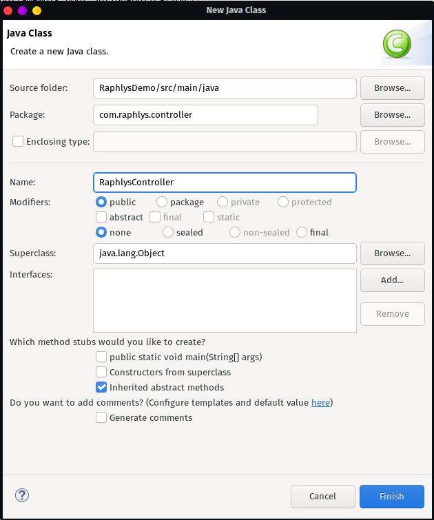 Une fenêtre s’ouvre, dans le champ « Name », on tape ‘com.raphlys.controller’ qui est notre nouveau package. On peut alors cliquer sur « Finish ».
