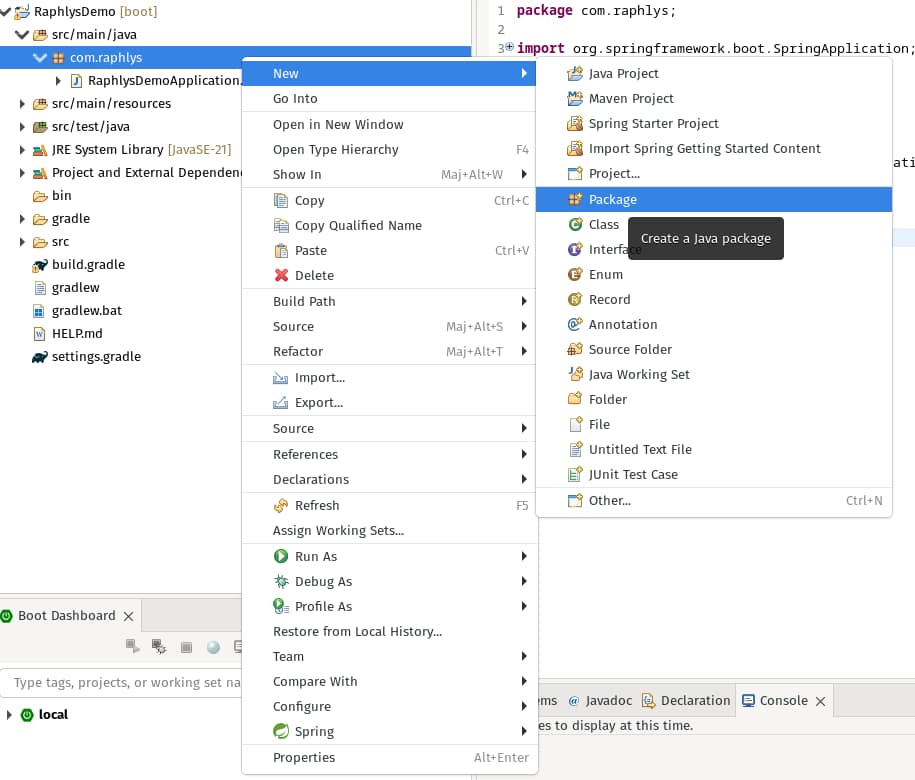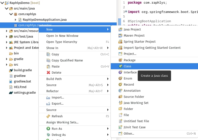 D’abord créons un package ‘com.raphlys.controller’. Pour ça clic droit sur le package ‘com.raphlys’ => New => Package