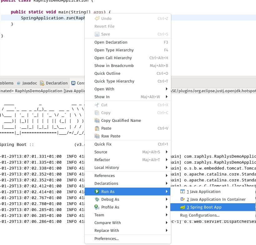 Vous pouvez alors vous rendre sur votre « RaphlysDemoApplication.java », faire un clique droit => « Run As » => « Spring Boot App ». Et voilà votre application est lancée sur le port 8080. C’est vraiment incroyable, de se dire qu’en si peu de temps vous avez réussi à faire un CRUD. Malheureusement celui-ci n’est pas branché à une base de données, mais ça viendra.